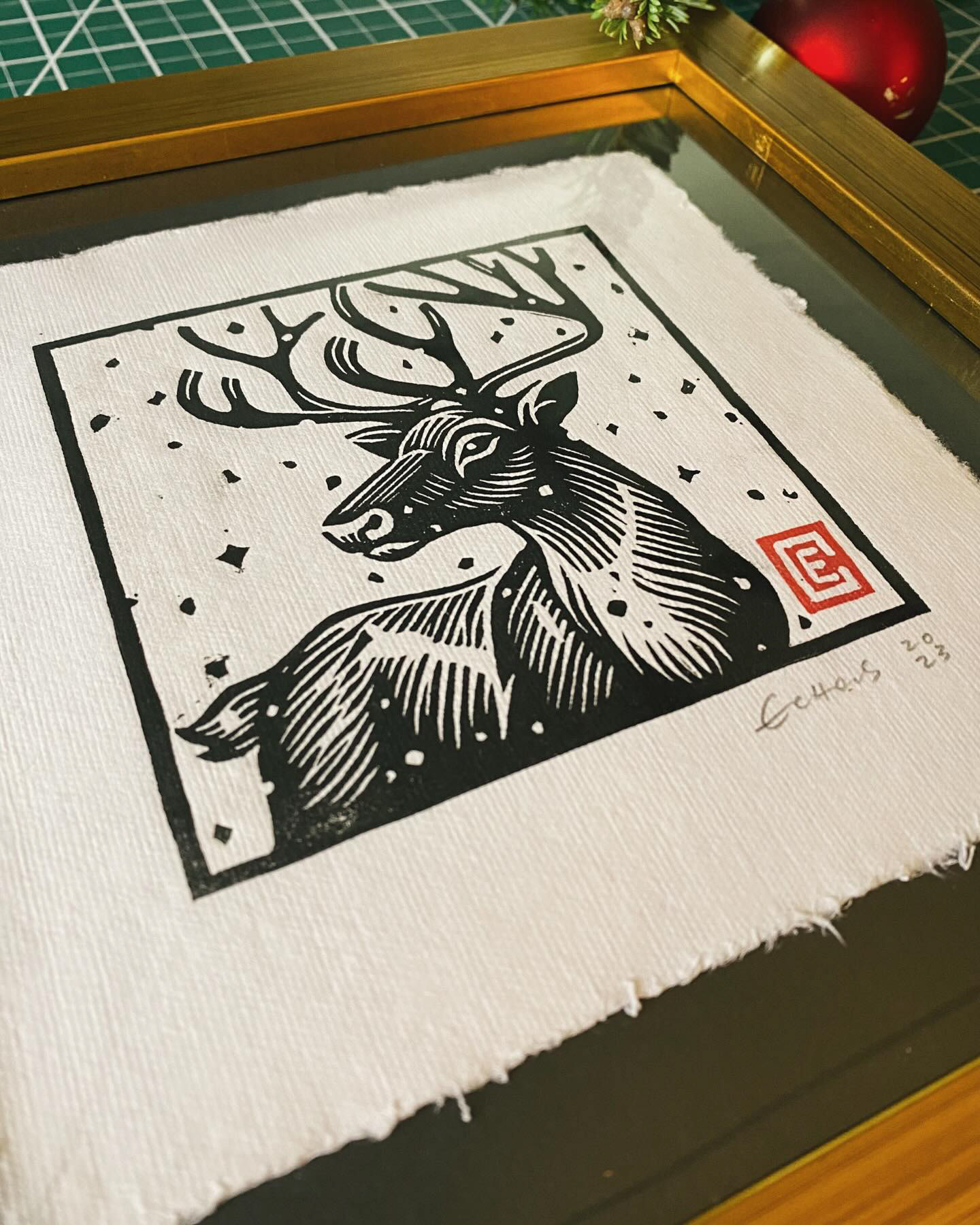 Carved in unmounted linoleum, inked with Speedball Supergraphic Black, and pressed on my Woodzilla A3.
