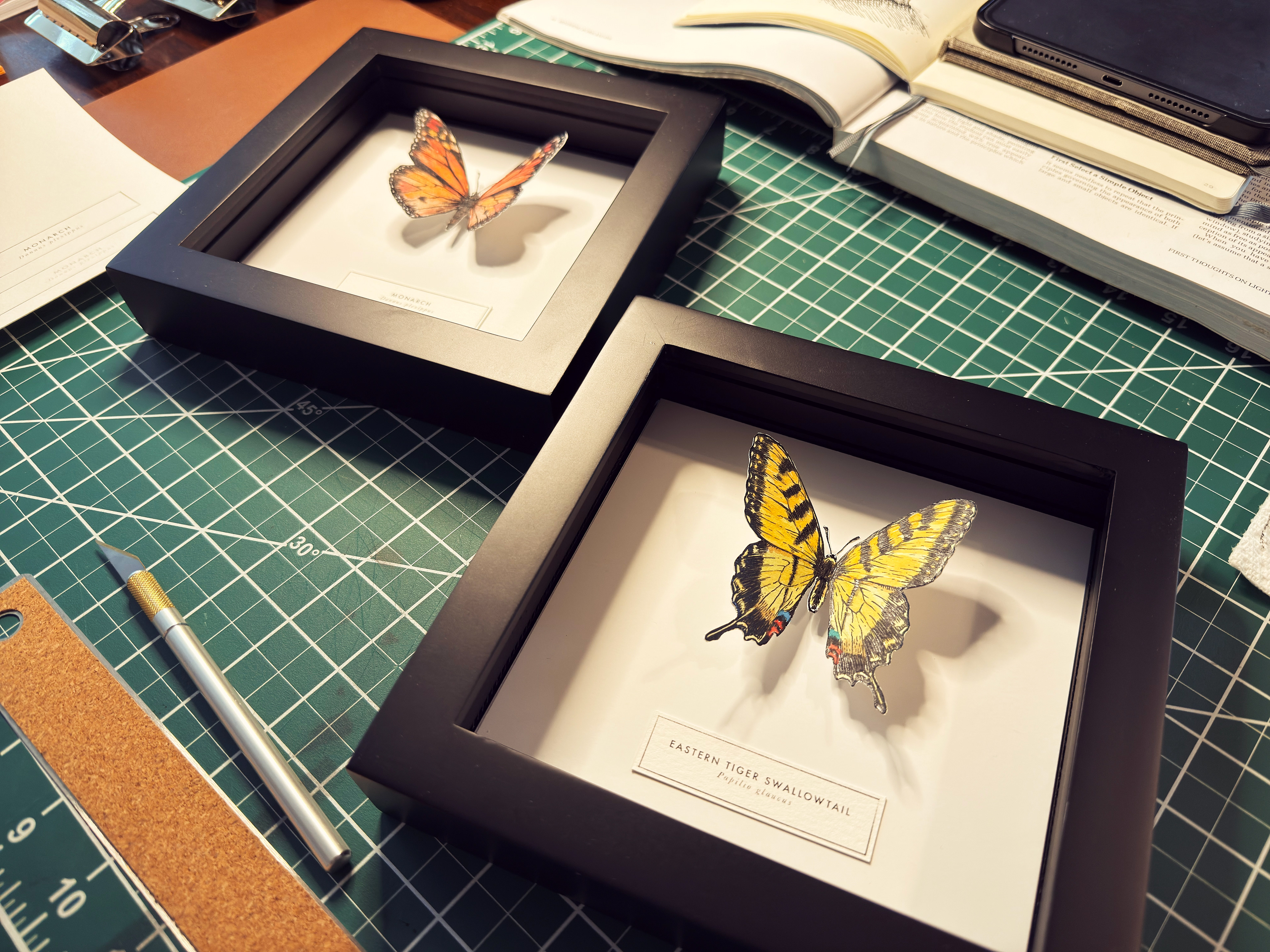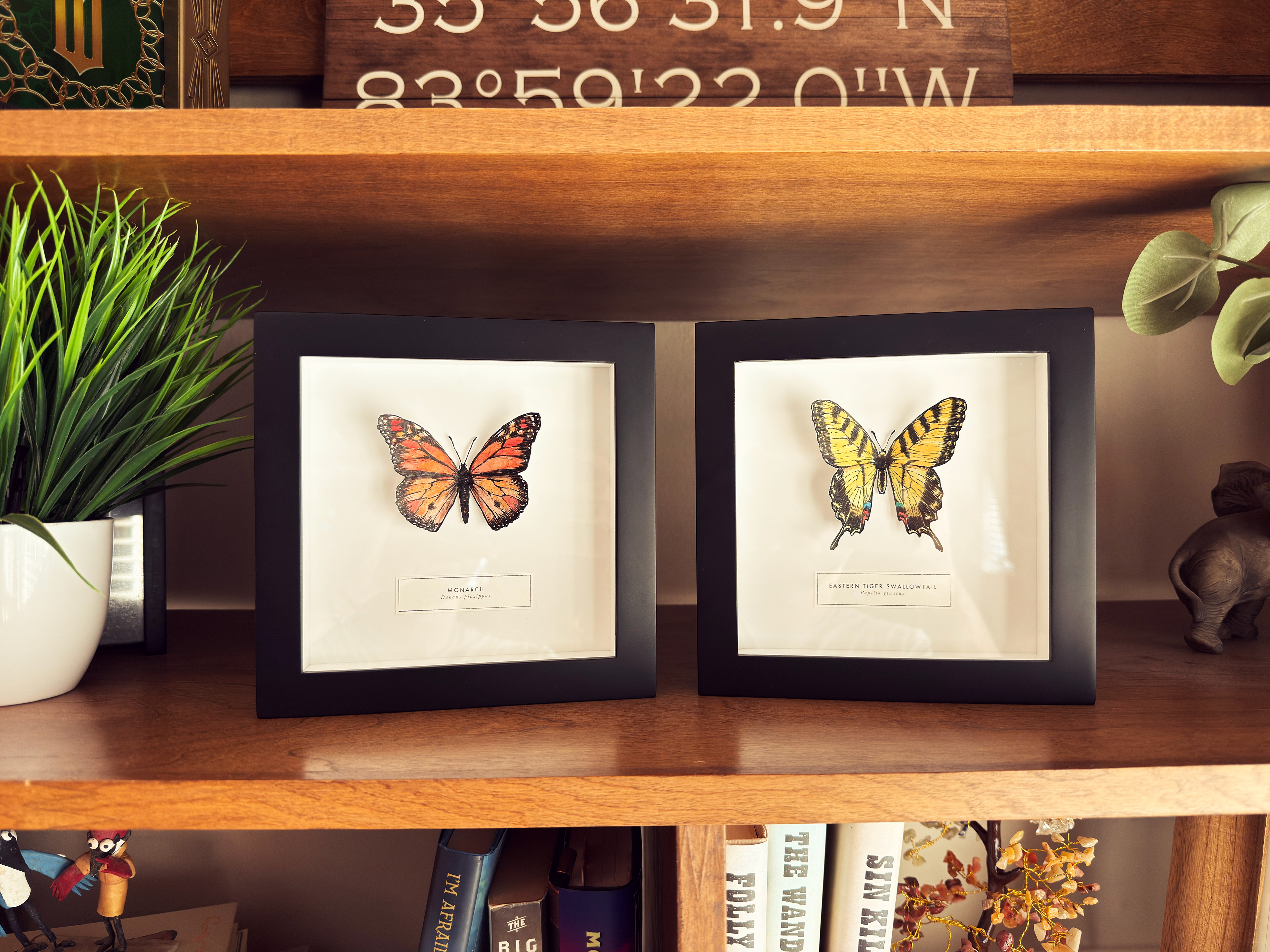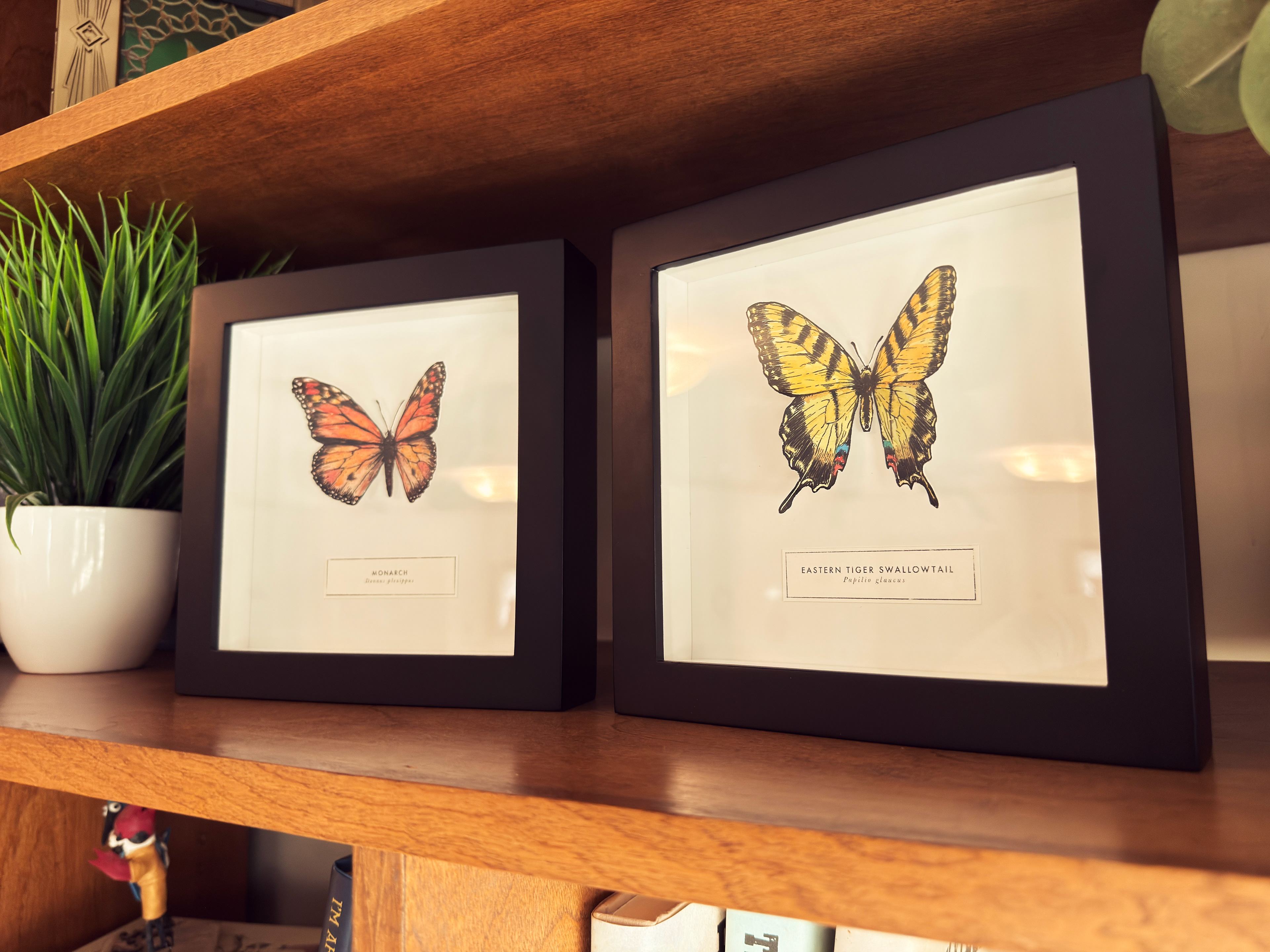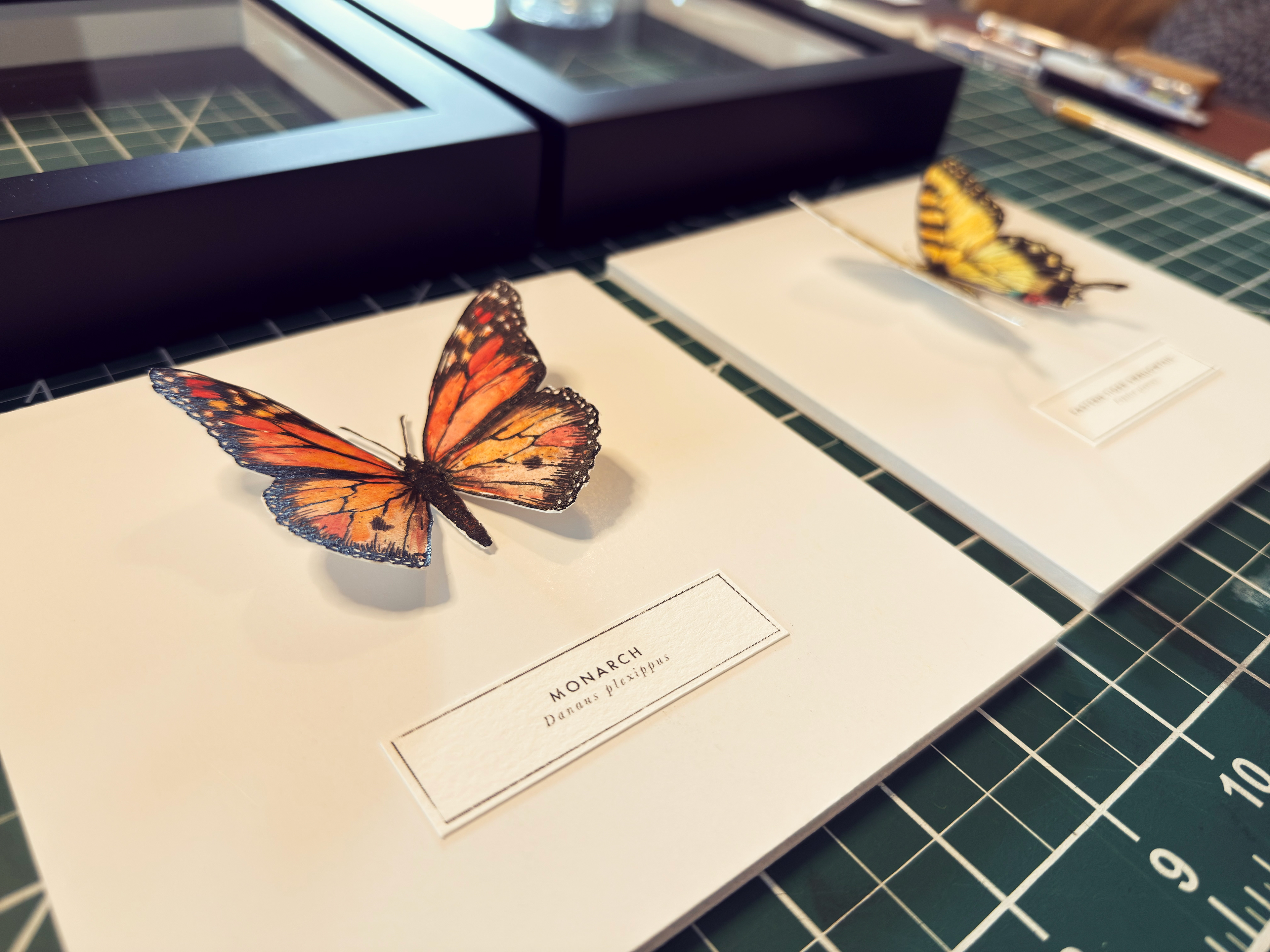 Dip pen and watercolor butterflies mounted in custom shadowboxes