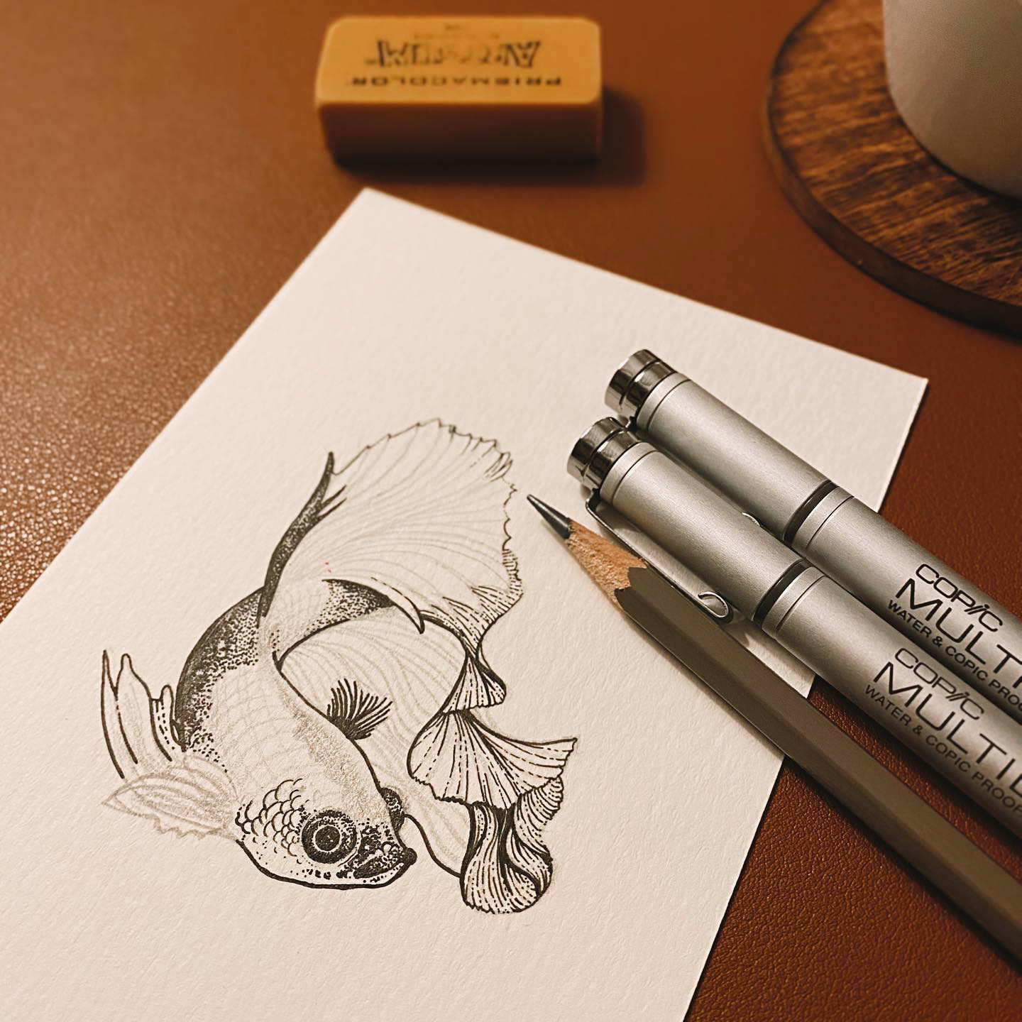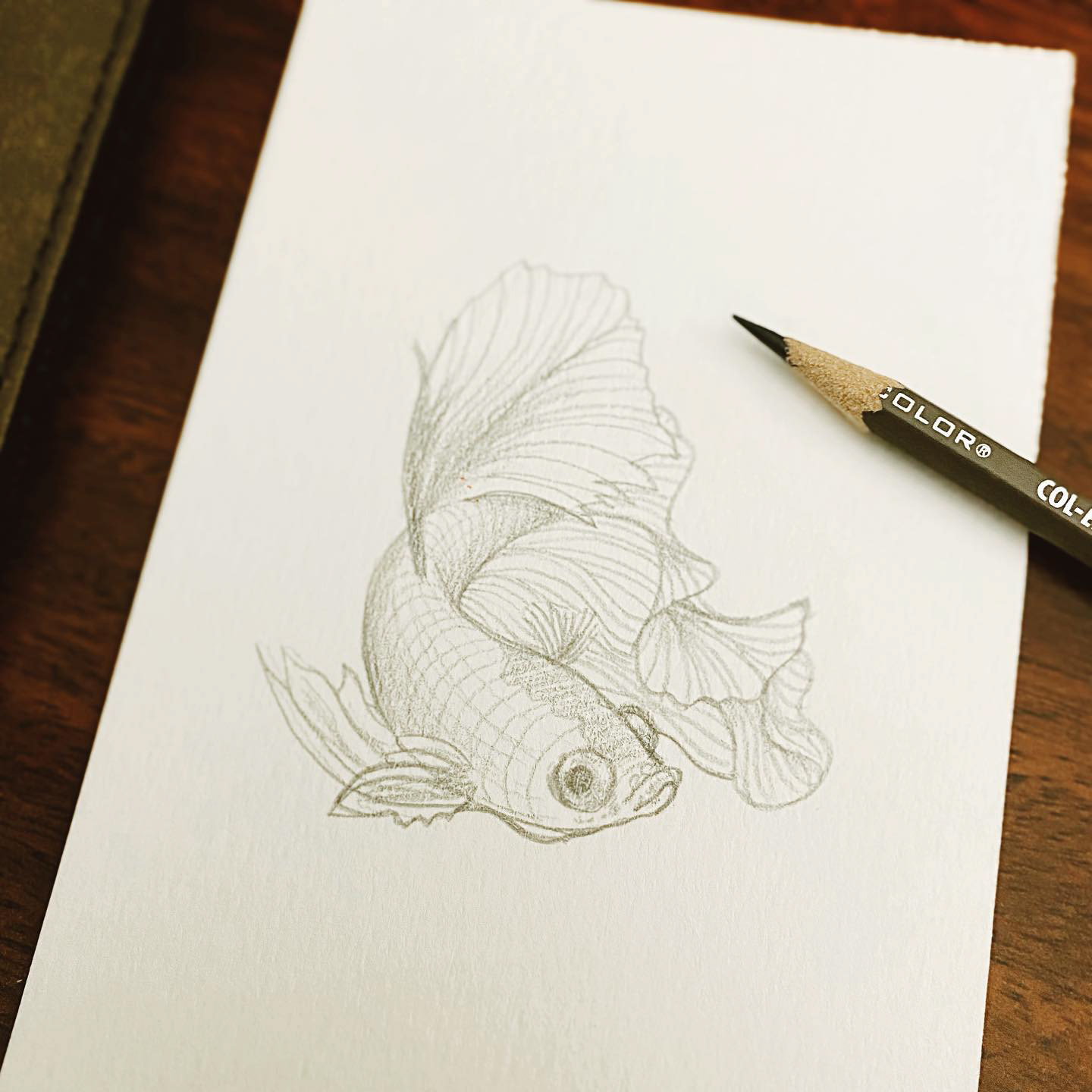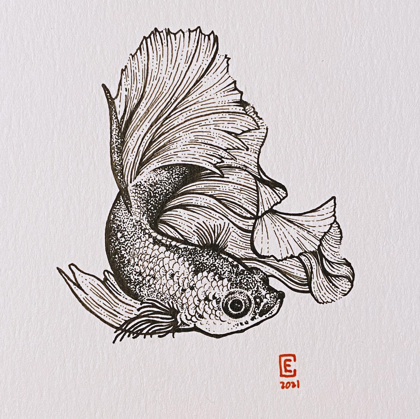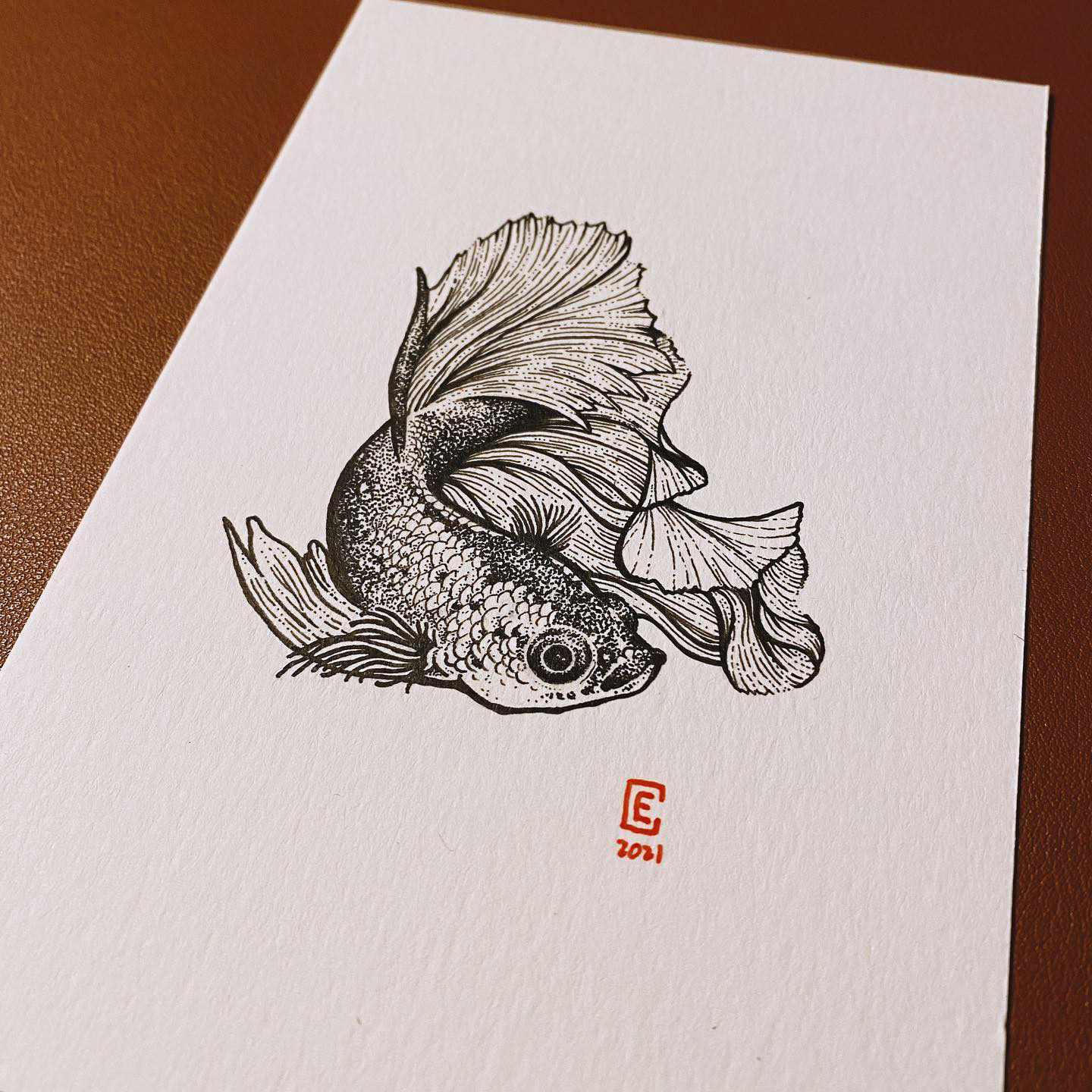 A million tiny dots in the shape of a betta fish, on a postcard